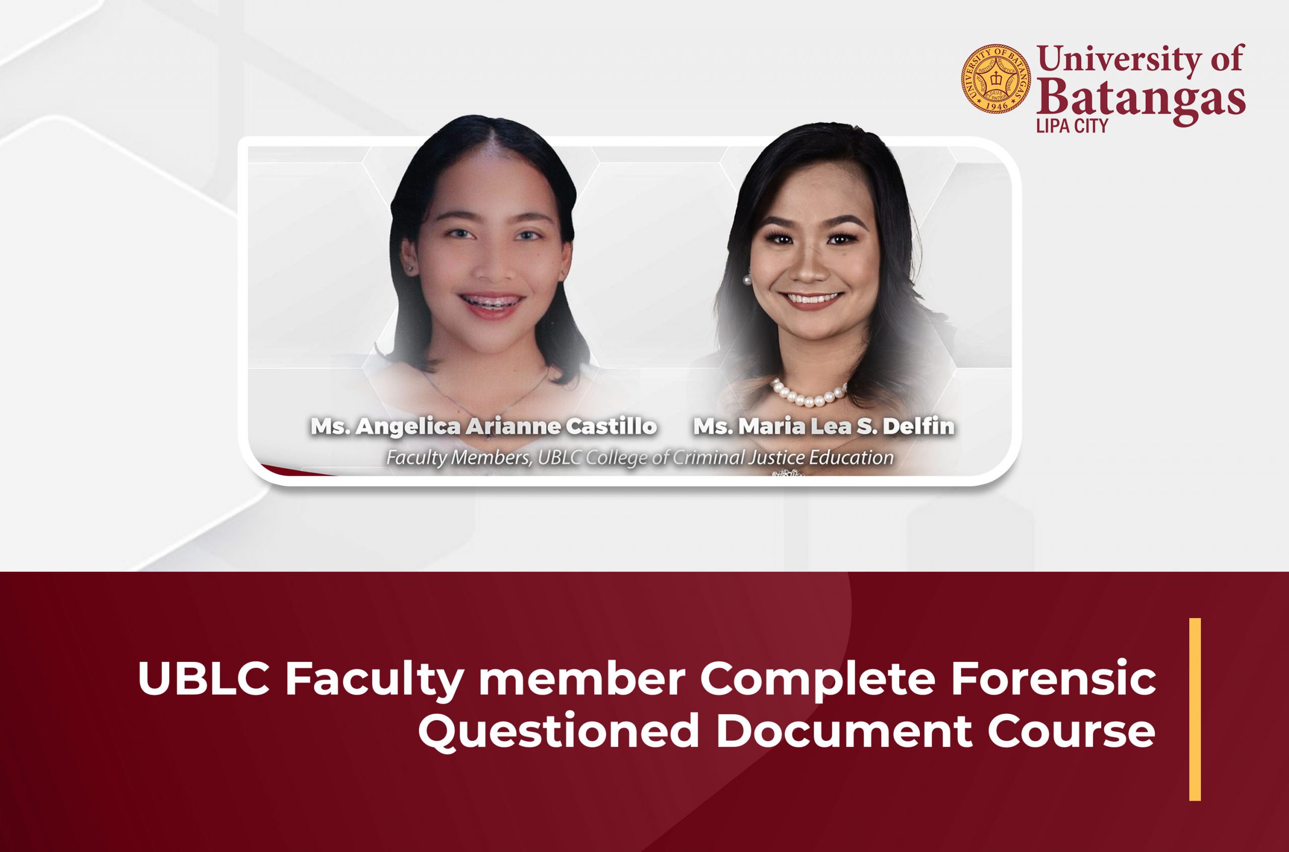 By completing this specialized training, Ms. Castillo and Ms. Delfin have further strengthened their expertise in the field, reinforcing UBLC’s commitment to providing quality education in criminal justice.