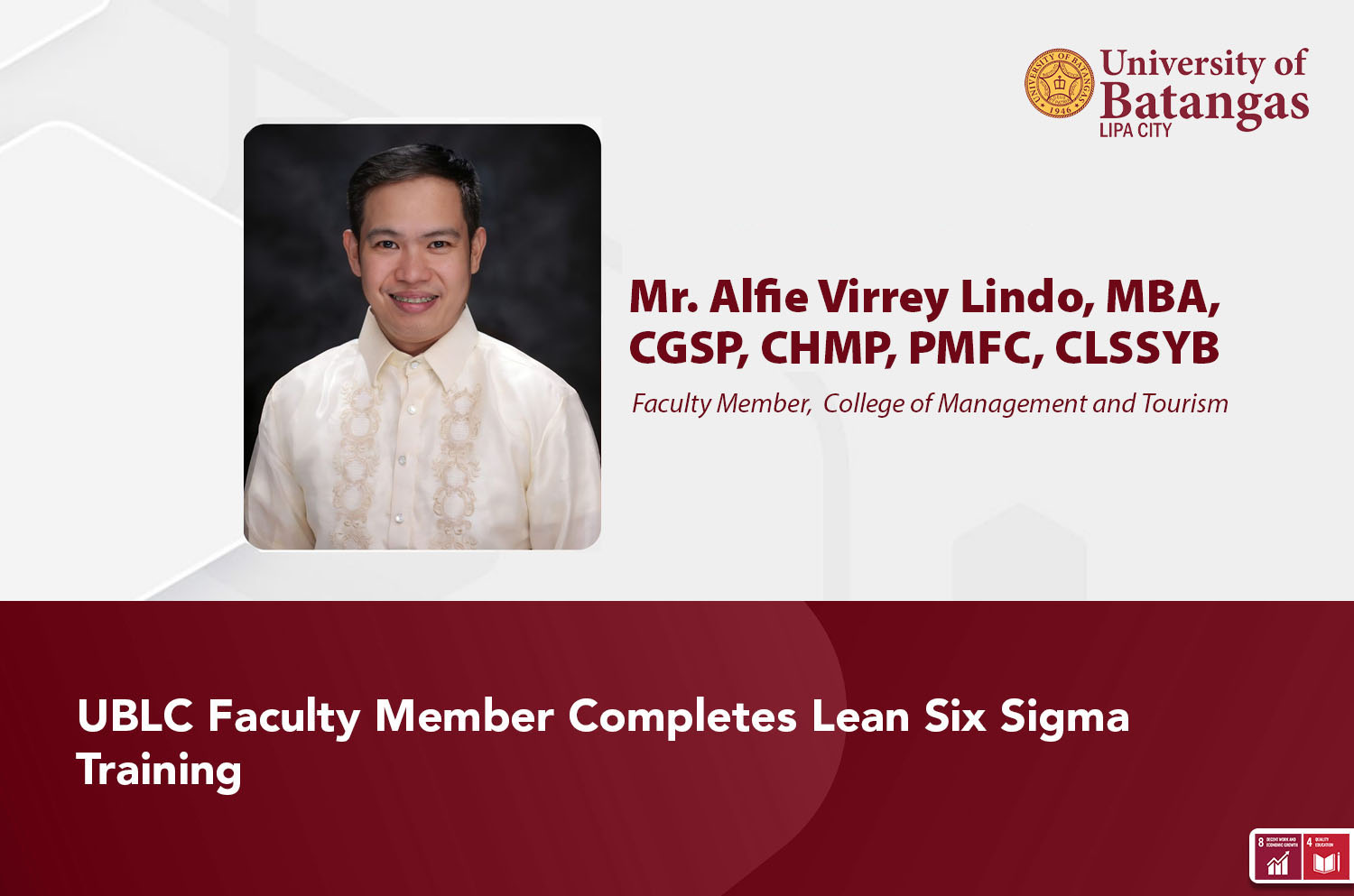 The University of Batangas Lipa City proudly congratulates Mr. Alfie Virrey Lindo, a faculty member of the College of Management and Tourism, for completing the 20-Hour Lean Six Sigma Yellow Belt Training. The training was conferred by the Council for Six Sigma Certification (CSSC) based in New York, USA.