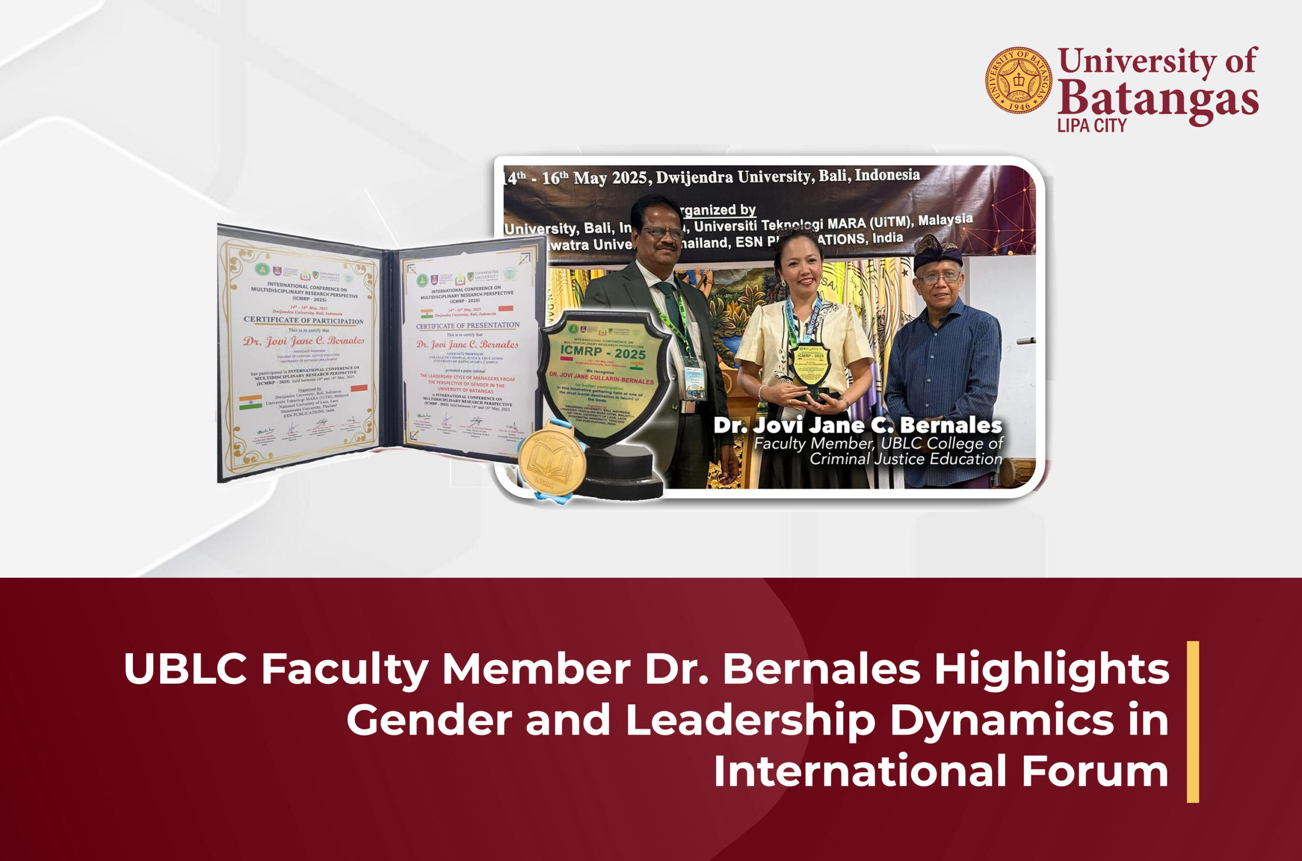 The University of Batangas, Lipa City (UBLC) congratulates Dr. Jovi Jane C. Bernales, a faculty member of the College of Criminal Justice Education, for successfully presenting her research at the International Conference on Multidisciplinary Research Perspective (ICMRP 2025) held on May 14, 2025, at Dwijendra University in Bali, Indonesia.