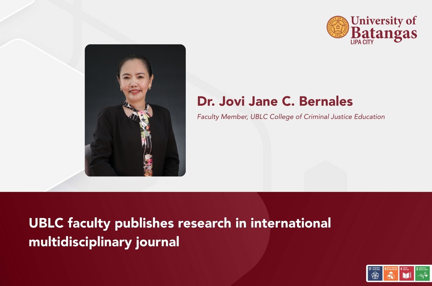 Lipa City, Batangas — August 2025. The University of Batangas Lipa City (UBLC) proudly congratulates Dr. Jovi Jane C. Bernales, faculty member of the College of Criminal Justice Education, for the successful publication of her research titled “Implementation of School-Based Sports Management Program of Private Higher Education Institutions” in the IOER International Multidisciplinary Research Journal.