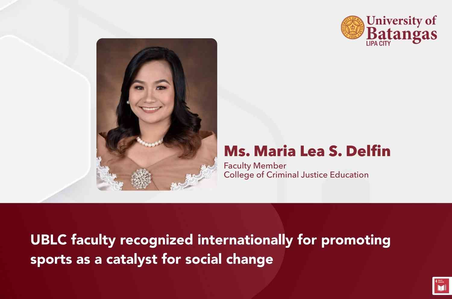 Ms. Maria Lea S. Delfin, faculty member of the University of Batangas Lipa City (UBLC) College of Criminal Justice Education, was honored as the Most Outstanding Promoter of Sports for Social Change at the International Eminence Awards 2025, organized by the International Association of Physical Education and Sports (IAPES), Inc., on November 29, 2025, in Hanoi, Vietnam.