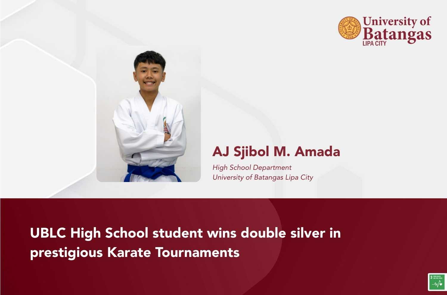 Demonstrating discipline, determination, and excellence, AJ Sjibol M. Amada, a student from the University of Batangas Lipa City (UBLC) High School Department, proudly secured two silver medals in consecutive karate tournaments held in July 2025.