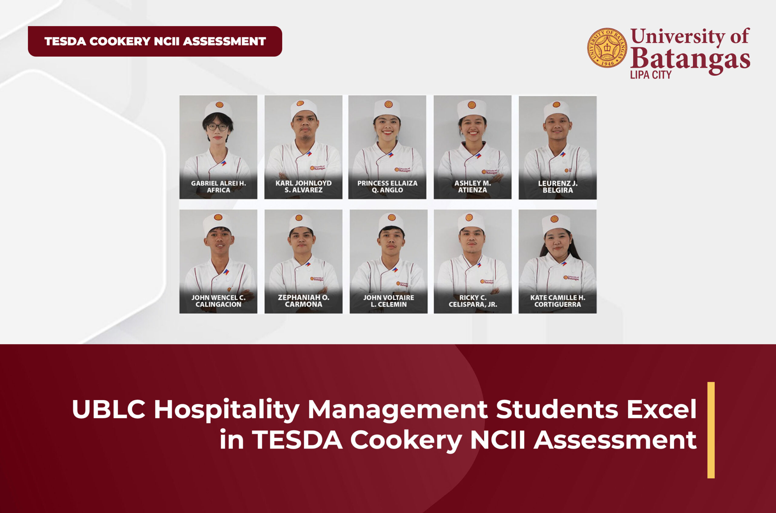 The University of Batangas, Lipa City (UBLC) proudly congratulates its first-year Bachelor of Science in Hospitality Management students from the College of Management and Tourism for successfully passing the TESDA Competency Assessment in Cookery NCII.