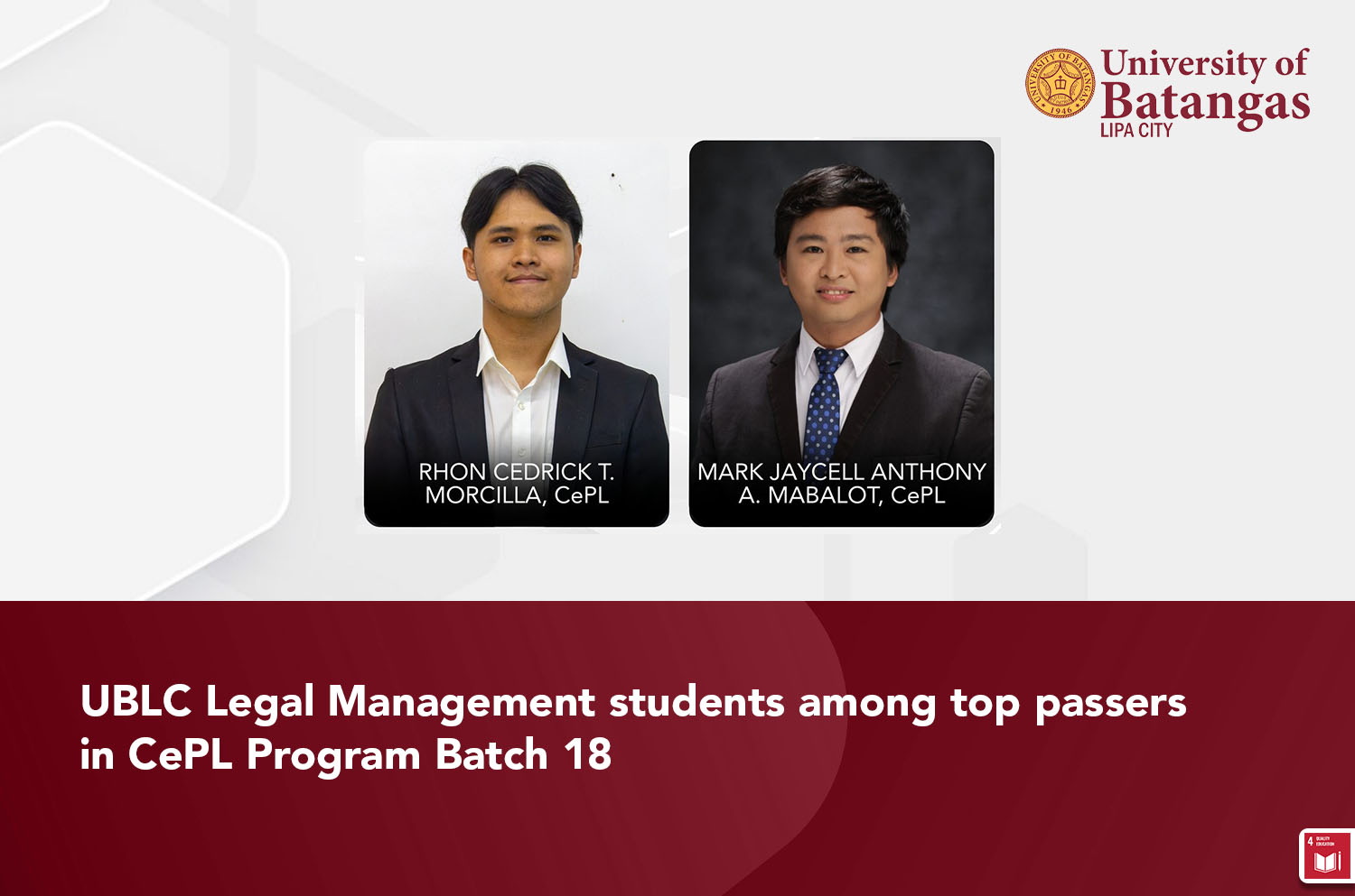 Lipa City, Batangas – September 7, 2025. Two Legal Management students from the University of Batangas Lipa City (UBLC) successfully passed the final examination of the Certified Paralegals and Legal Researchers (CePL) Program – Batch 18, conducted and administered by the Certified Paralegals and Legal Researchers Training Center, Inc. (CPLR, INC.). Rhon Cedrick T. Morcilla emerged as Rank 1, while alumnus Mark Jaycell Anthony A. Mabalot also earned his CePL certification.