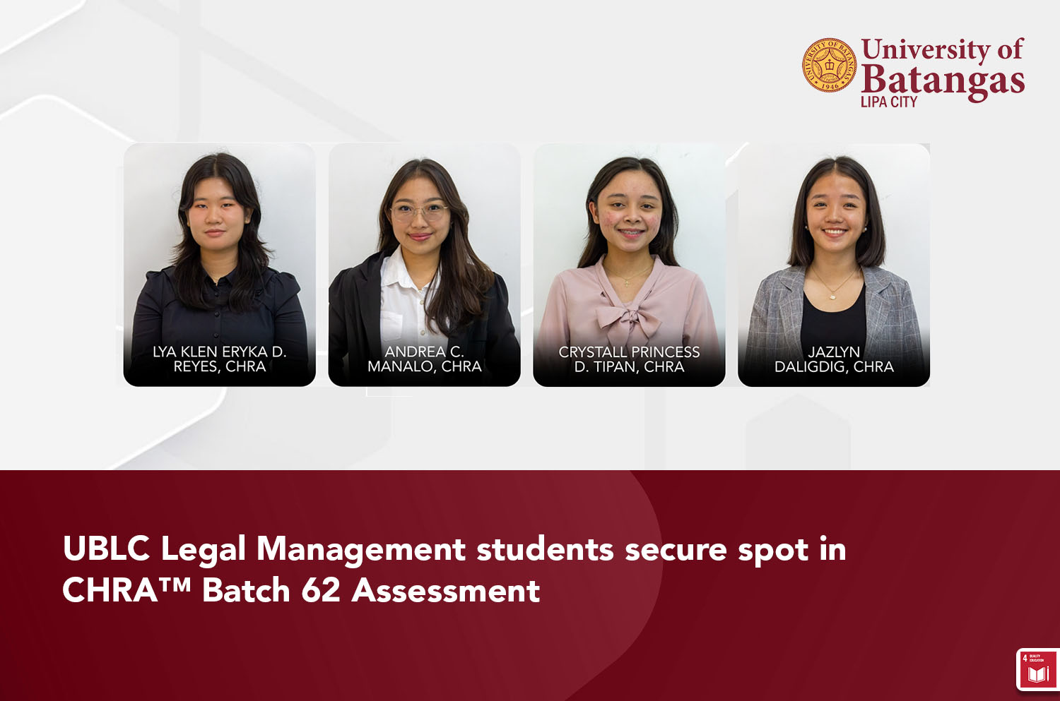 Leading the UBLC delegation was Ms. Lya Klen Eryka D. Reyes, CHRA, who proudly achieved Top 1 Ranking in the national certification exam, solidifying UBLC’s reputation as a breeding ground for competent and globally competitive students. Joining her in this milestone were fellow Legal Management students Ms. Andrea C. Manalo, CHRA, Ms. Crystall Princess D. Tipan, CHRA, and Ms. Jazlyn Daligdig, CHRA, who all successfully earned their professional certification.