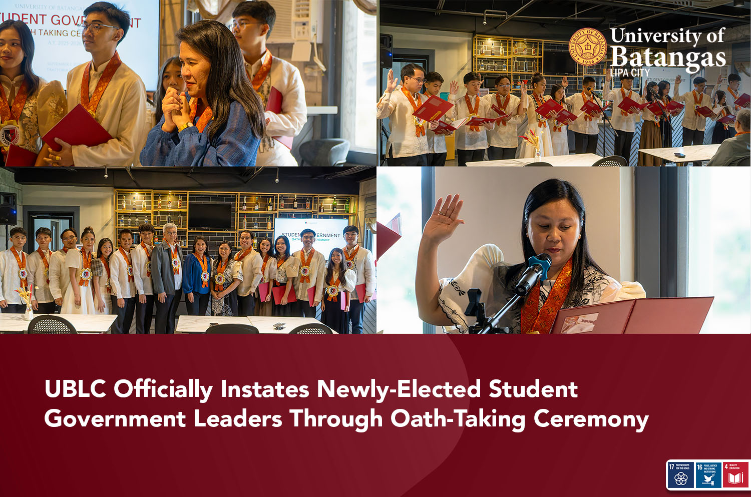 Lipa City, Batangas – September 1, 2025. The University of Batangas Lipa City (UBLC) officially instated its newly-elected Student Government (SG) leaders for Academic Year 2025–2026 through an oath-taking ceremony held at Trattoria Lipeña.