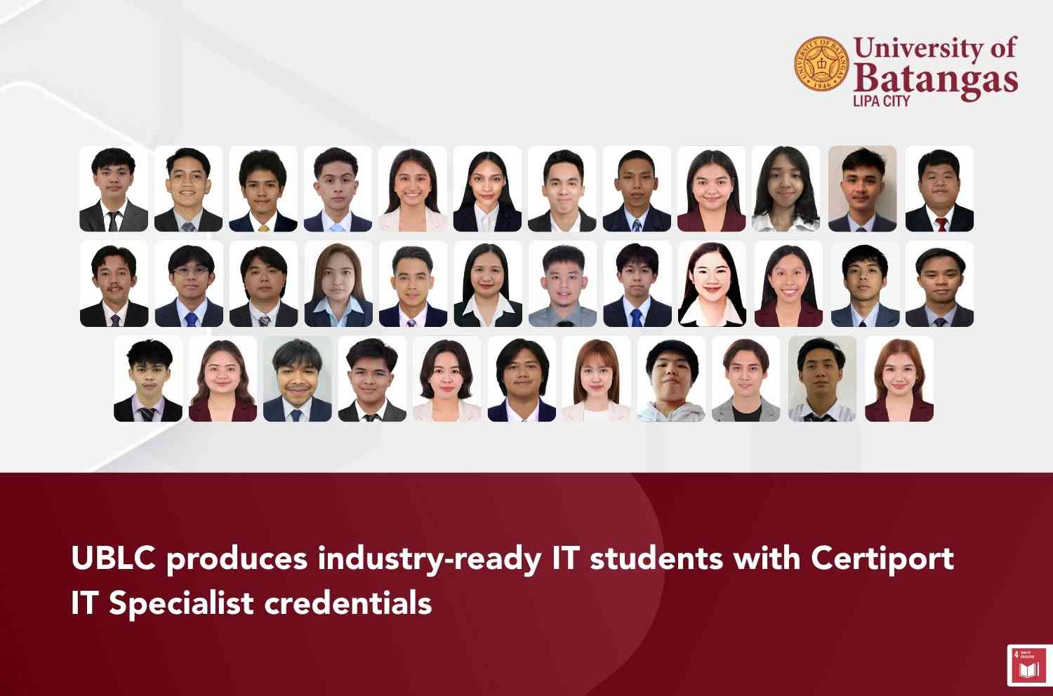 Thirty-five graduating students from the Bachelor of Science in Information Technology (BSIT) program under the College of Information Technology, Entertainment and Communication of the University of Batangas Lipa City successfully passed the IT Specialist Examination on August 2, 2025, an internationally recognized certification awarded by Certiport, a Pearson VUE business established in 1997.