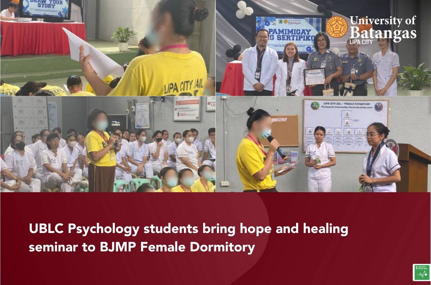 Fourth-year psychology students from the University of Batangas Lipa City (UBLC) conducted a psychoeducational outreach program titled, “Lakas at Pag-asa: Paglalakbay mula sa Nakaraan Tungo sa mas Maliwanag na Bukas,” at the Bureau of Jail Management and Penology (BJMP) Female Dormitory, November 3.