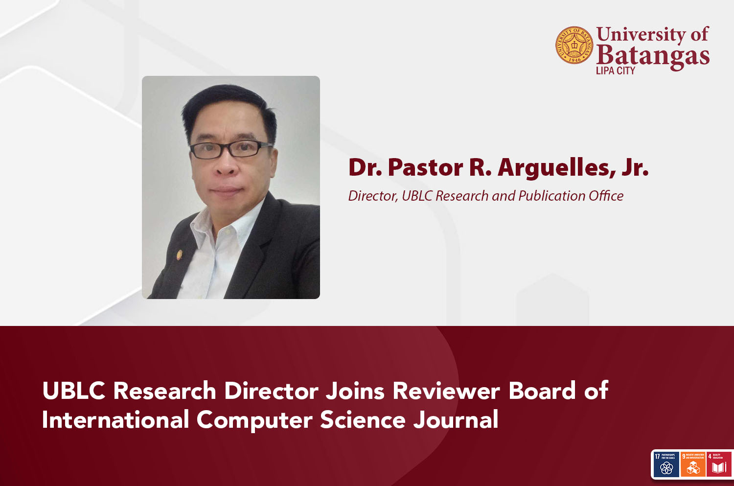 The University of Batangas Lipa City proudly congratulates Dr. Pastor R. Arguelles, Jr., Director of the UBLC Research and Publications Office, for his recent