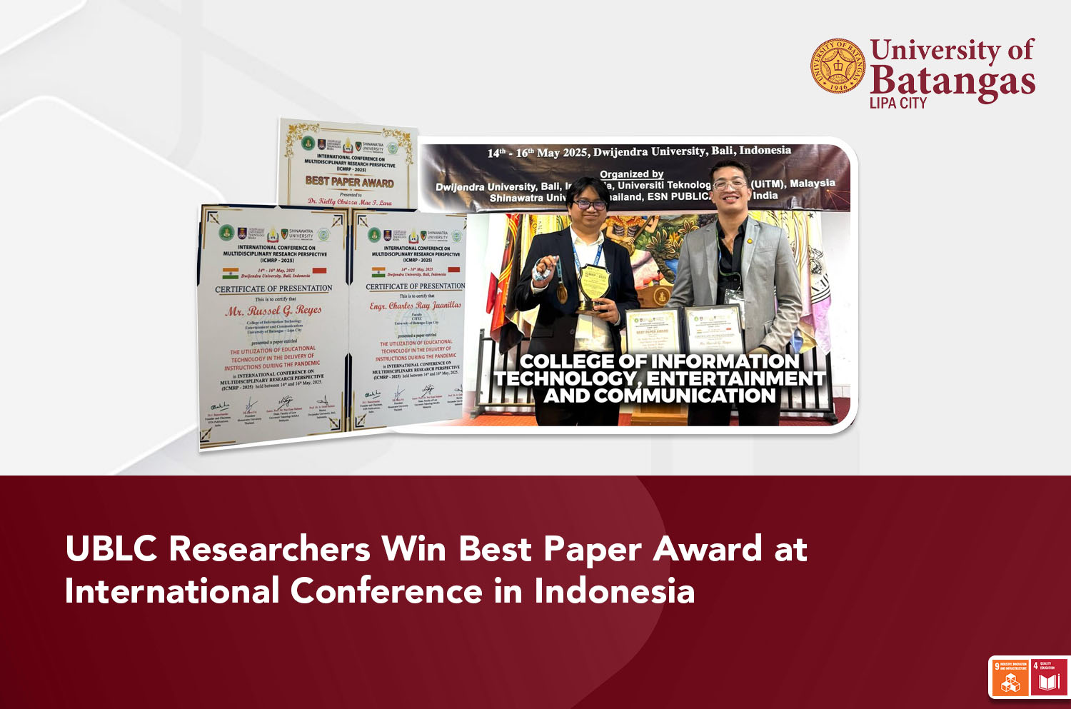 The University of Batangas – Lipa City (UBLC) proudly recognizes Mr. Russel G. Reyes and Engr. Charles Ray Juanillas for receiving the Best Paper Award at the International Conference on Multidisciplinary Research Perspective (ICMRP 2025) held at Dwijendra University in Bali, Indonesia.