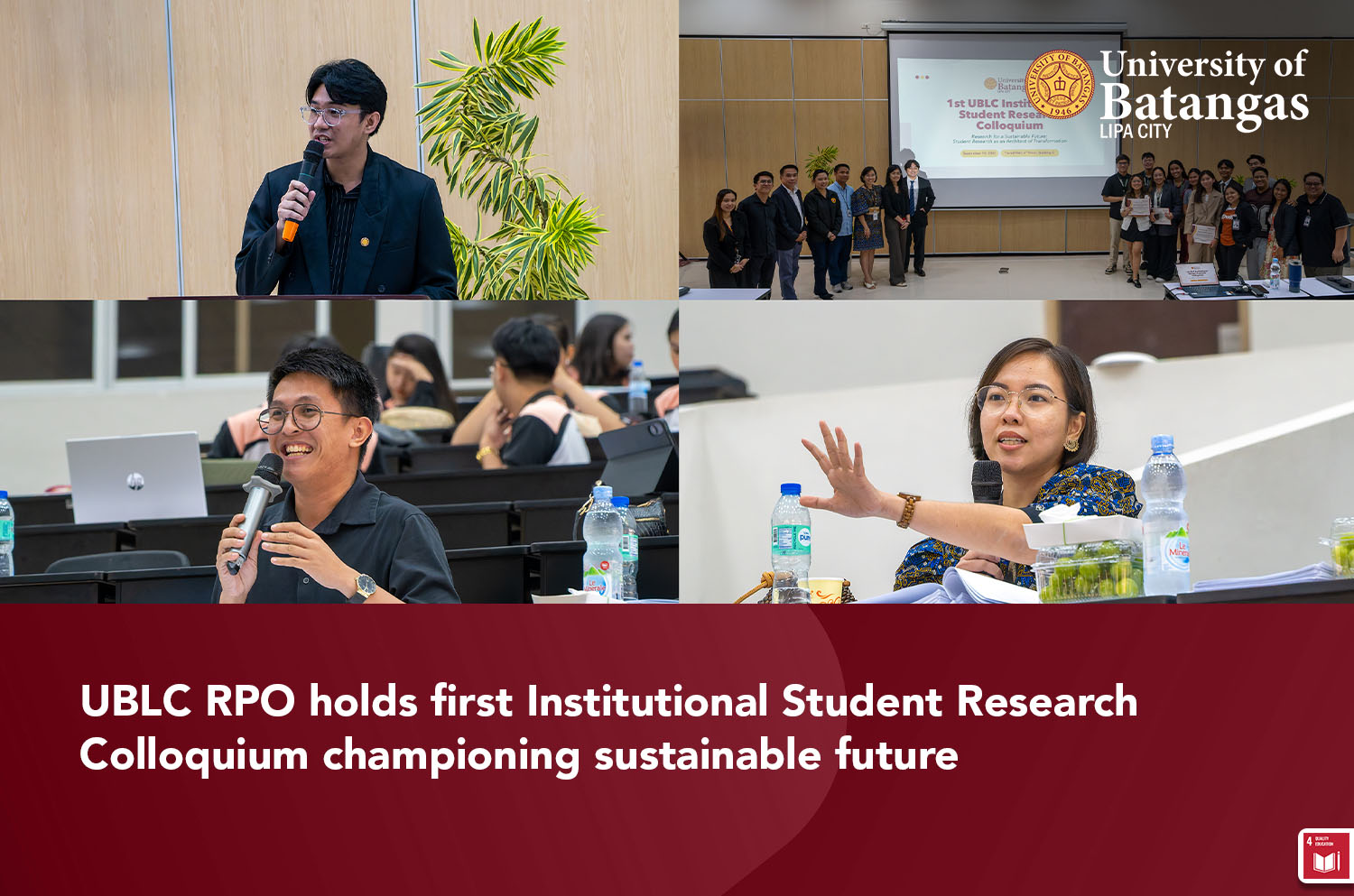 Lipa City, Batangas – September 19, 2025. The University of Batangas Lipa City (UBLC), through the Research and Publications Office (RPO), successfully held its first Institutional Student Research Colloquium with the theme “Research for a Sustainable Future: Student Research as An Architect of Transformation.” The event followed the success of the UBian Research Proposal Colloquium: Institutional Research Presentation conducted last August 29, 2025.