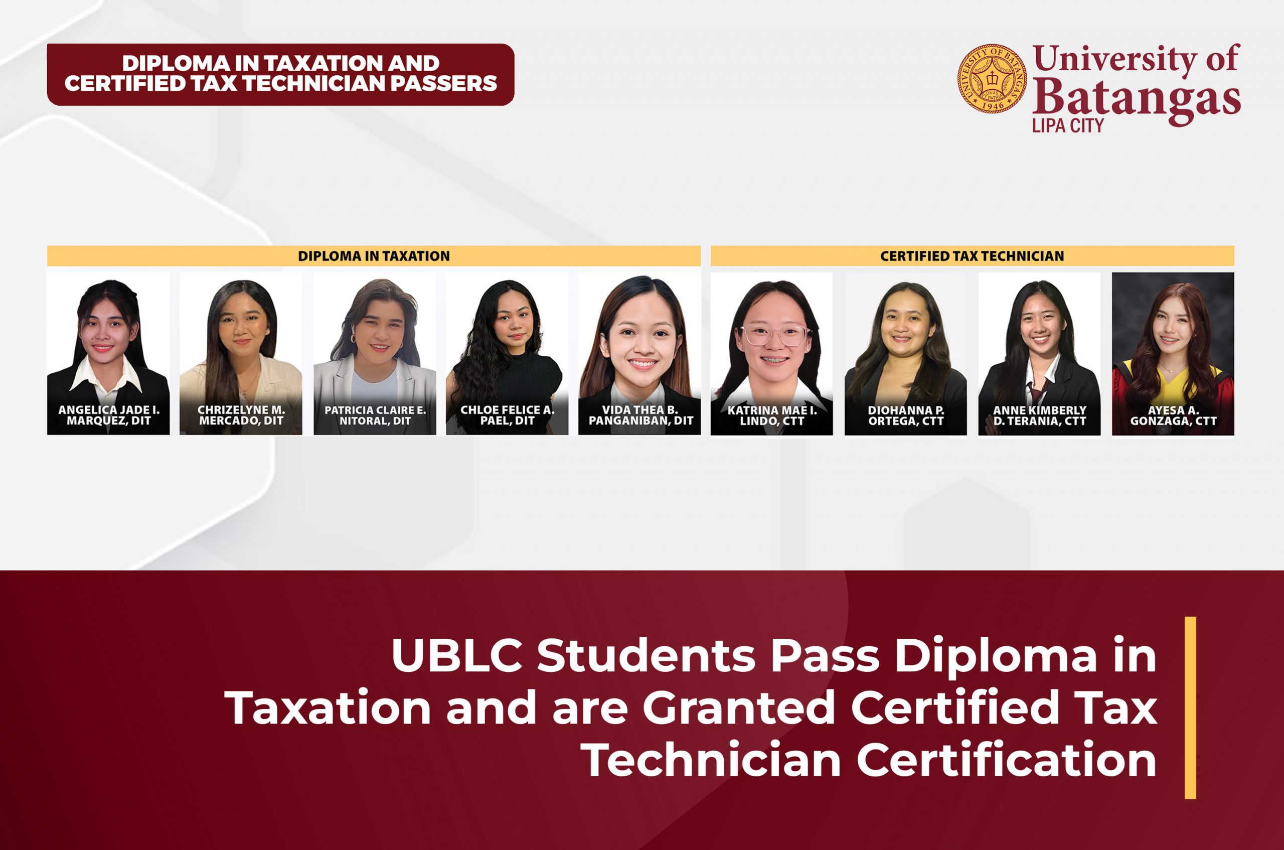 We are thrilled to celebrate the outstanding achievement of our students from the UBLC – College of Management and Tourism: Angelica Jade I. Marquez, DIT, Chrizelyne M. Mercado, DIT, Patricia Claire E. Nitoral, DIT, Chloe Felice A. Pael, DIT, Vida Thea B. Panganiban, DIT, Katrina Mae I. Lindo, DIT, Diohanna P. Ortega, CTT, Anne Kimberly D. Terania, CTT & Ayesa A. Gonzaga, CTT who successfully passed the Diploma in Taxation (DIT) and earned the prestigious title of Certified Tax Technician (CTT).