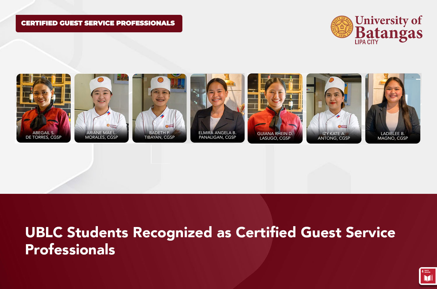 The University of Batangas Lipa City – College of Management and Tourism celebrates the success of its students who were recently recognized as Certified Guest Service Professionals for June 2025. This certification was given by the American Hotel and Lodging Association (AHLA), a well-known organization in the hospitality industry.