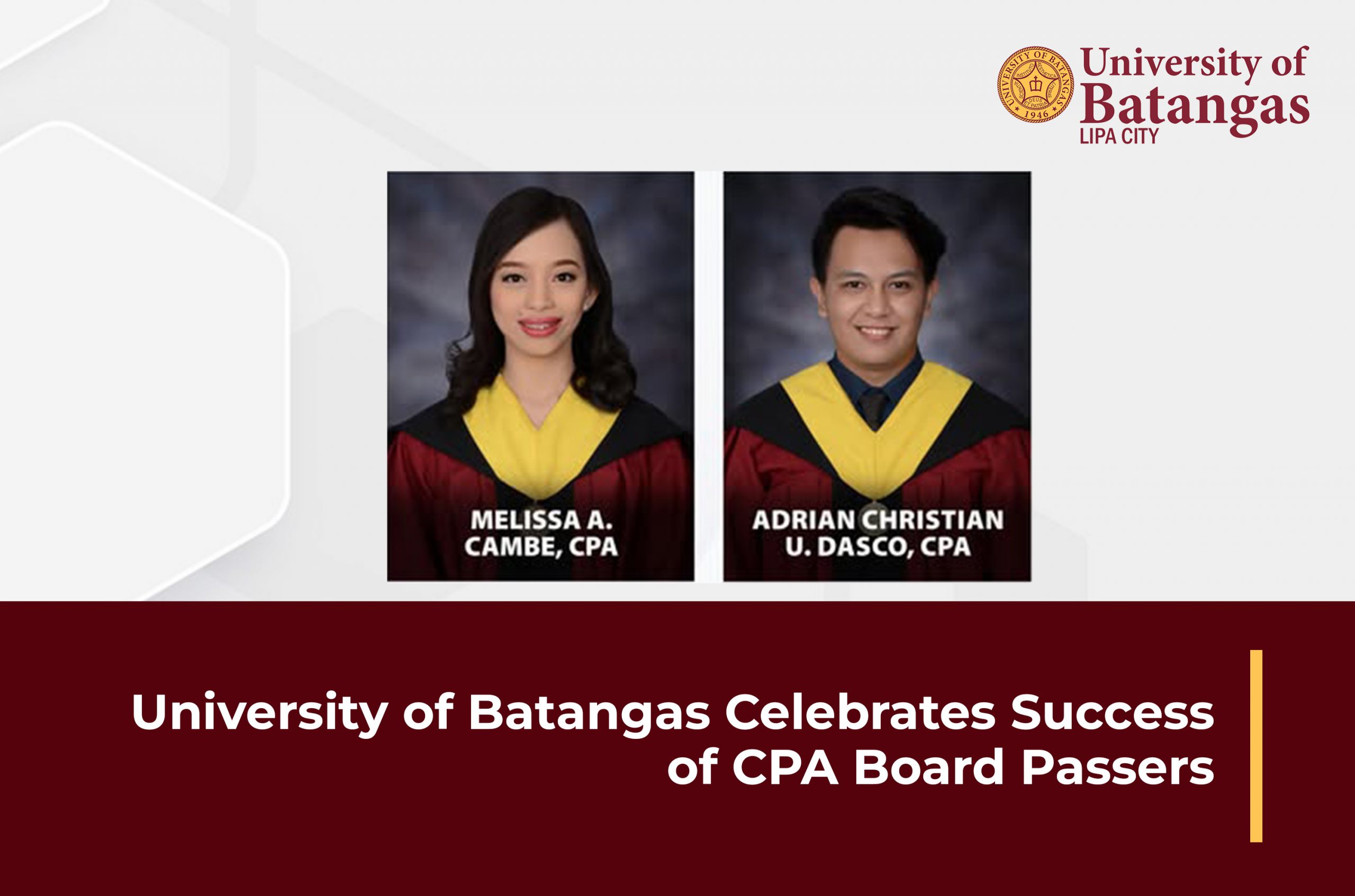 The University of Batangas extends its heartfelt congratulations to Melissa A. Cambe, CPA, and Adrian Christian U. Dasco, CPA, for their exemplary accomplishment in successfully passing the December 2024 CPA Licensure Examination. This significant milestone stands as a testament to their unwavering dedication, perseverance, and diligence throughout their academic and professional endeavors.