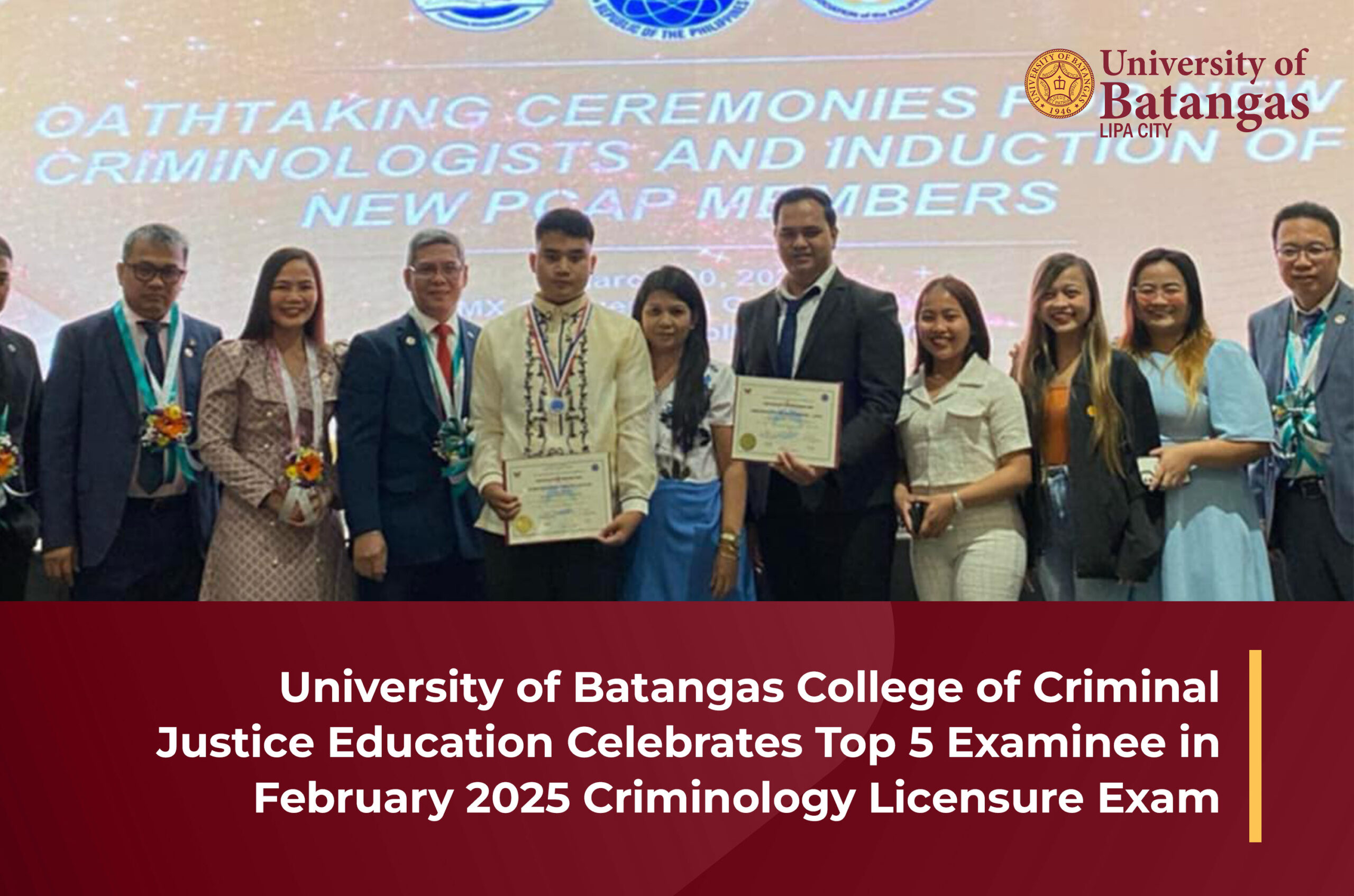 The College of Criminal Justice Education at the University of Batangas in Lipa City is pleased to share its outstanding success in placing fifth among examinees in the February 2025 Licensure Examination for Criminologists. At an award ceremony held on March 30, 2025, at the SMX Convention Center in Manila, the Professional Regulation Commission (PRC) and the Professional Regulatory Board of Criminology formally presented the exceptional accomplishment.